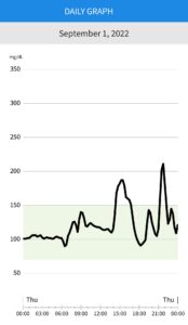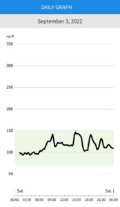 また、別の日は炭水化物と大好きなお菓子を控えてみました。そうすると、血糖上昇も緩やかで血糖値自体も低く抑えられていることがわかりました。ちょっとした工夫でこれだけ違うのですから健康管理とはまさにチリも積もれば・・ですね。
