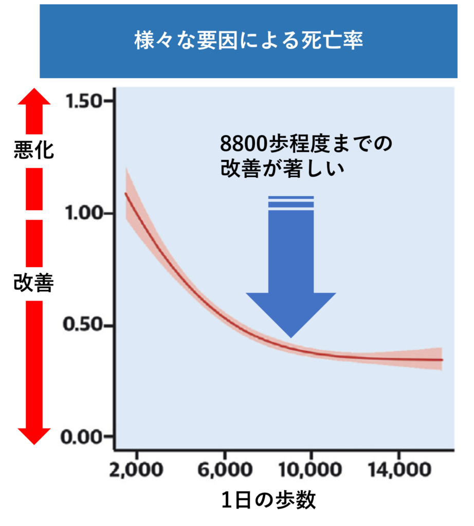 つい最近、心臓領域で有名な医学雑誌で興味深い論文が発表されました。様々な過去の論文をまとめて評価するメタ解析という手法を用いて、1日の歩数と様々な病気による死亡率との関係などが調べられました。それによると約2600歩/日程度から全死亡率が減少し始め、8800歩/日程度まで死亡率の改善が顕著に認められました。それ以上の歩数でも死亡率の低下は示されましたが、8800歩/日までに劇的な効果があり、それ以上はそれほど強いインパクトを与えるような影響はありませんでした。