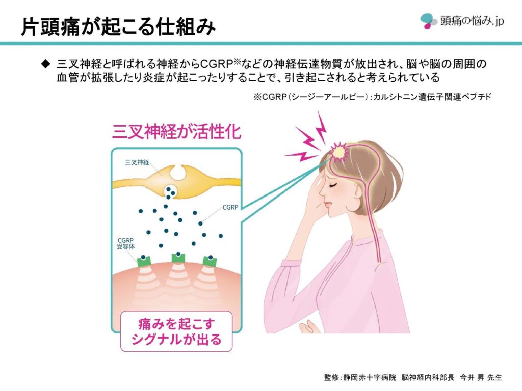 片頭痛の原因の一つとして注目されているCGRP(カルシトニン遺伝子関連ペプチド)は三叉神経から放出され、血管周囲の炎症や拡張、それにともなう神経の興奮を促し、特徴的な『ズキンズキン』する頭痛をもたらすとされています。このCGRPそのものの効果を抑える(抗体)、もしくはCGRPが働く作用点(受容体)をブロックすることで片頭痛発作を効果的に予防することができるようになりました。