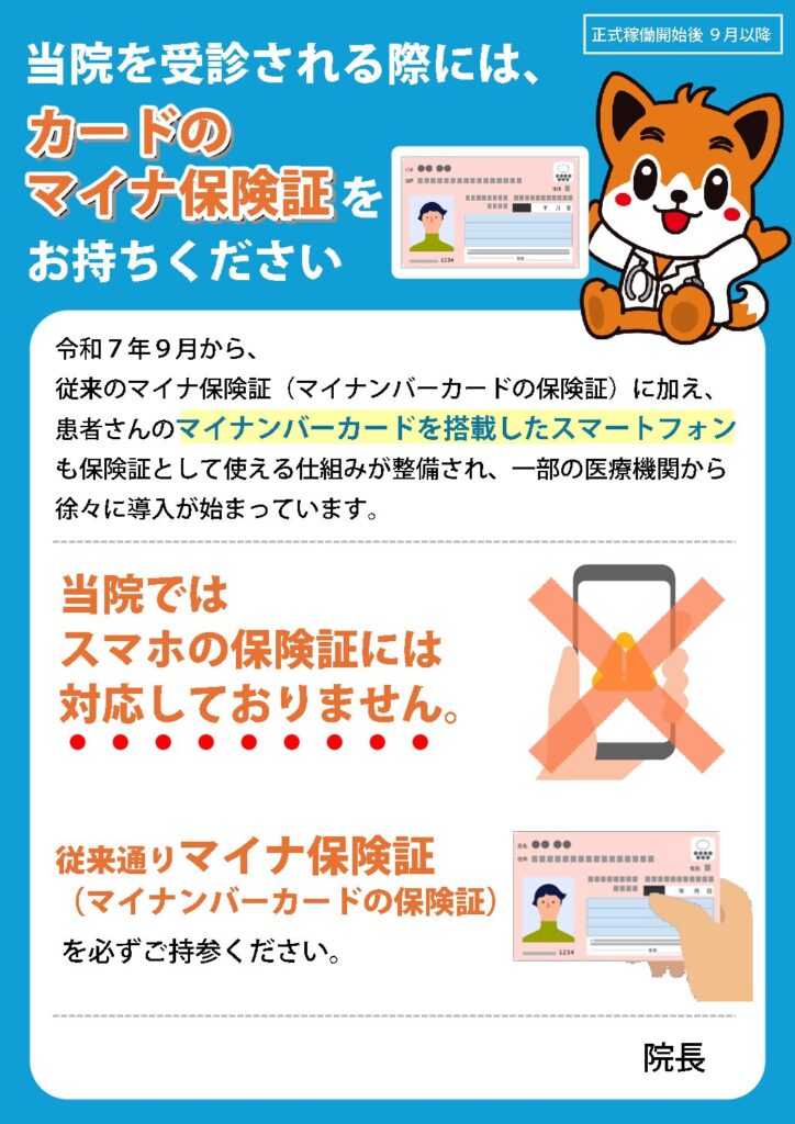 マイナンバーで受診される方が当院でも増えてきました。一部報道にありますとおり、スマートフォンへの保険証の実装も徐々に行えるようになってきていますが、当院ではマイナンバーカードを搭載したスマートフォンには対応しておりませんので、受診の際はマイナンバーカードのご用意をお願いいたします。