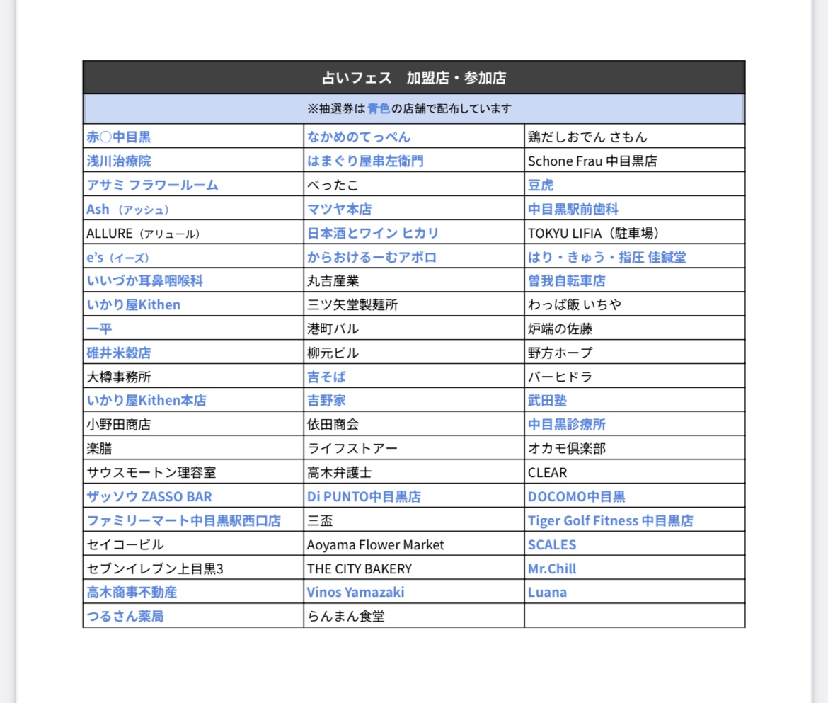 そんな中、中目黒でも占いまつりを行うことになりました。対象期間内(9月16日~30日)に加盟店舗で500円以上お買い上げいただくと抽せん券をお渡しします。抽せん券にあるQRコードを読み込んでいただき、申し込みをされてください。