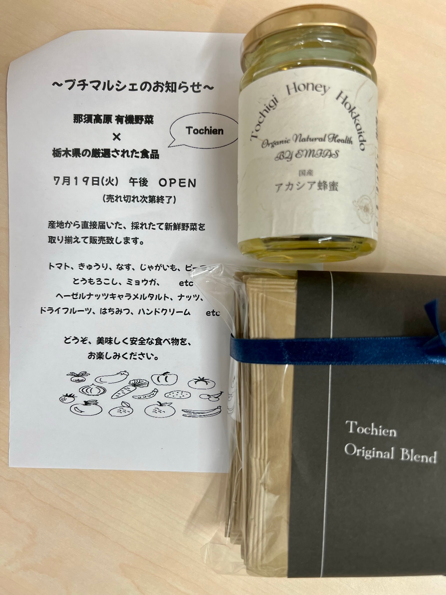 今日は休業日とのことでしたが、お店の前で野菜やはちみつ、ナッツにコーヒーなどなど・・・が売られていました。お話を伺うと、那須高原の有機野菜、栃木県産の厳選食品などを置いているとのこと。お店の方に勧められるがままに、はちみつレモンをいただきました。暑い中でいただく一杯、一瞬で汗が引くくらいさっぱりしました。(ご馳走様でした。)私は美味しいはちみつ(アカシア100%)とコーヒーを購入。職員もホウレンソウなどを買っていました。