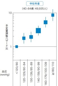 脳卒中や心疾患の危険性という観点からいくと、120/80mmHg未満が最もその危険性が低く理想的であるということが分かっています。120/80mmHgを底辺とし血圧上昇とともに脳心血管死亡危険度が上昇することが分かっています。(図1)