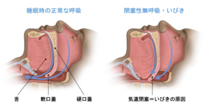 いびきをかいている人をよく見ると、口を開けて寝ていたり、下あごがのどの方に下がっていたりします。このような物理的な圧迫が睡眠時の呼吸を妨げ、いびきの原因となっているのです。
