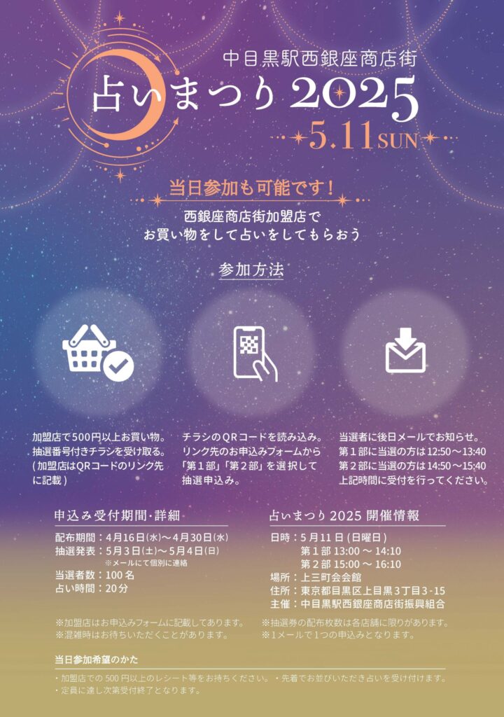 昨年に引き続き、占い祭りが行われます。中目黒駅西銀座商店街の目玉企画になりつつありますが、例年大盛況です。当院も商店街の一員としてご協力しておりますので、チラシご希望の方はお声掛けください。